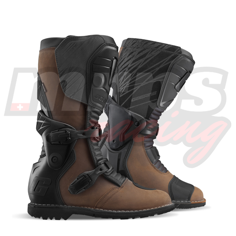 Sa structure en cuir Nubuck de haute qualité intègre le système de pivot "wrap-around", une articulation de cheville qui offre un soutien latéral rigide indispensable en tout-terrain, sans jamais entraver la souplesse nécessaire à la marche ou au passage des rapports. La protection est omniprésente : plaque tibiale anatomique, coque de talon renforcée et un insert en cuir suédé sur la face interne qui, en plus de protéger de la chaleur du moteur, assure un grip exceptionnel pour piloter debout avec précision. Pour parer à toutes les météos, la membrane Gore-Tex intégrée garantit une imperméabilité totale tout en permettant une évacuation efficace de l'humidité.