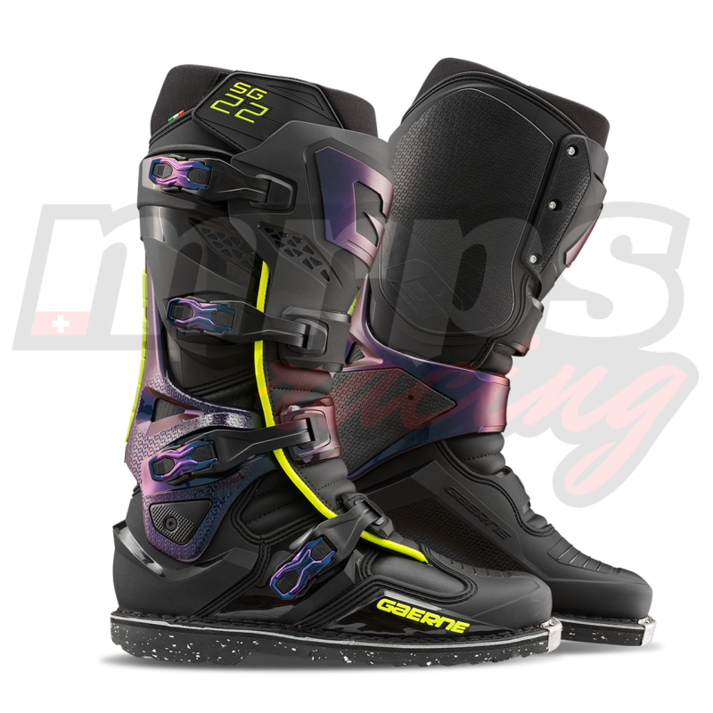 La Gaerne SG22 s'impose comme la botte de motocross de premier choix pour les pilotes dont l'unique objectif est la domination en compétition. Héritière de la légendaire lignée Gaerne, elle bénéficie d'une ingénierie de pointe pour offrir une symbiose parfaite entre protection rigide et liberté de mouvement. "Made in Italy", elle incarne le futur du pilotage tout-terrain.