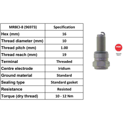 Bougie NGK Spark Plug MR8CI-8 (96973) type Laser Iridium, à l'unité.