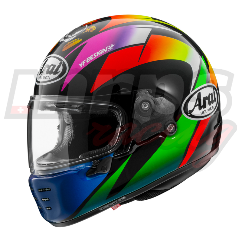 Donc sous l’aspect agressif, vous trouverez une coque PB e-cLc résistante et légère, avec une forme lisse et ronde, renforcée avec la ceinture périphérique exclusive d'Arai, pour glisser sur les surfaces et ricocher sur les obstacles. Avec son aspect mécanique rétro, le système d’écran VAS-VC renforce encore les performances de ricochet, en abaissant le point de pivot de la visière pour maximiser une coque supérieure lisse.