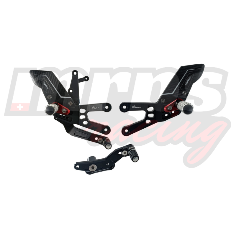 Les commandes reculées Lightech sont réalisées en aluminium 7075 taillé dans la masse et sont fabriquées dans l'usine de la marque en Italie. Elles sont livrées complètes et prêtes à monter. La présence d'un quickshifter / blipper non origine peut impliquer une modification de la tige de sélection fournie. Les pièces détachées sont disponibles sur demande et sur commande.