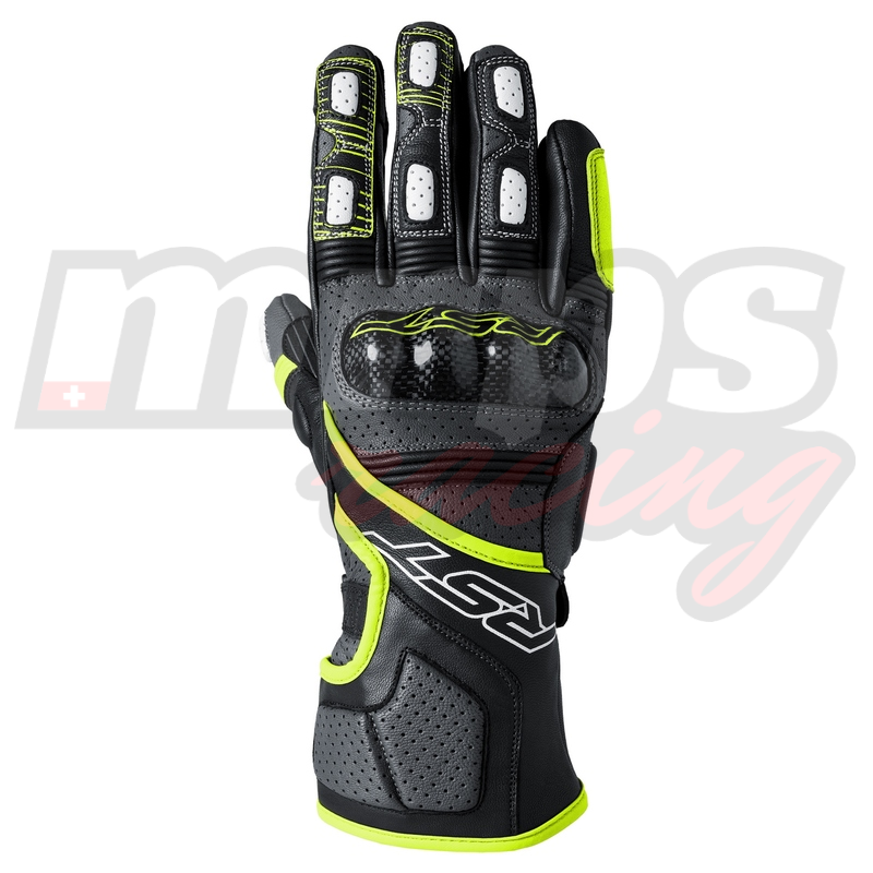Les gants RST Fulcrum sont conçus pour la conduite sportive sur route. Ils offrent des protections d'articulations en fibre de carbone, des doigts préforméés et surpiqués, du cuir tactile digital sur le pouce et l’index (touch ready), d'une double couche de cuir sur la paume et d'une prise en main antidérapante.