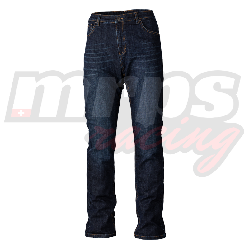 Un jean 5 poches de style classique avec coupe des jambes droite (straight leg). Fabriqué en denim extensible avec une doublure en fibre d'aramide dans les zones d'impact clés telles que le côté des hanches, l'assise et les genoux. Certifié CE de niveau A, une protection supplémentaire est également offerte par la protection de genoux CE de niveau 1 et une poche pour la protection des hanches.