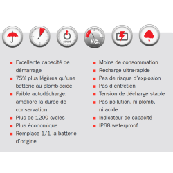 Les batteries lithium-ion ont la plus grande densité d'énergie de toutes les batteries rechargeables, jusqu'à 70% plus légères que leurs équivalentes au plomb-acide. Elles bénéficient d'un poids fortement réduit, d'une autodécharge très faible et peuvent s'installer sans risque dans n'importe quelle position et sont dotées d'une excellente durée de vie (plus de 2000 cycles contre 150 à 300 pour une batterie au plomb).