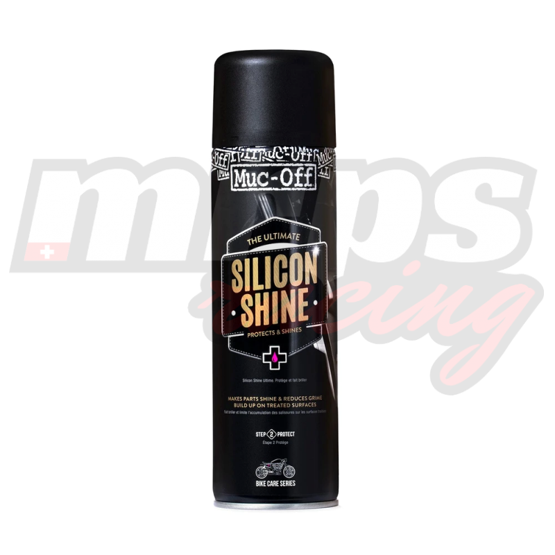 Non seulement le spray Muc-Off Silicon Shine rend à votre moto son aspect neuf, mais en plus il lubrifie les éléments de suspension et réduit l'adhérence des poussières et de la saleté.