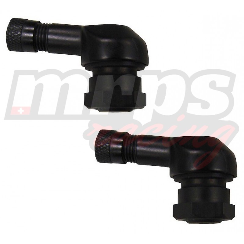 Paire de valves tubeless en aluminium, Ø11.5mm, coudées à 80°. Couleur noir.